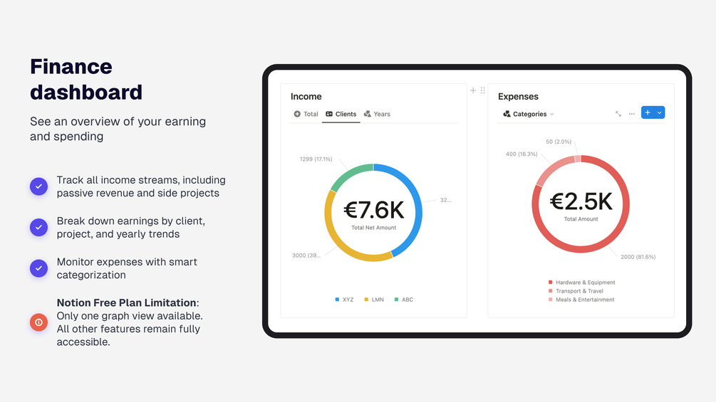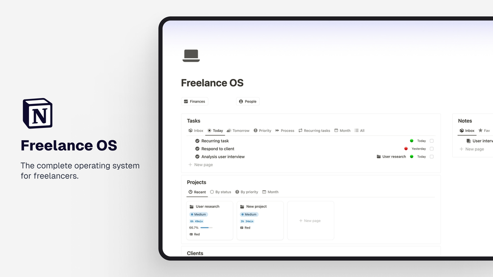 A complete Notion dashboard to manage your entire freelance business - from tasks and projects to invoices and finances.