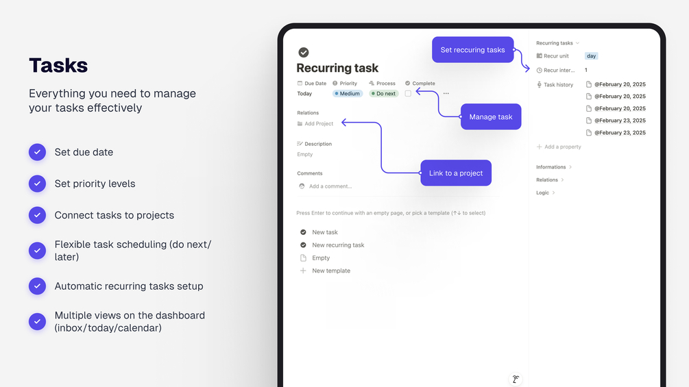 Task Management Manage your daily workflow with dedicated inbox, today, and tomorrow views. Set up recurring tasks that automatically track completion history.