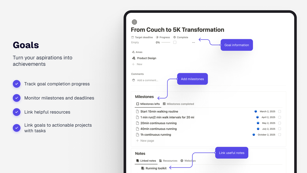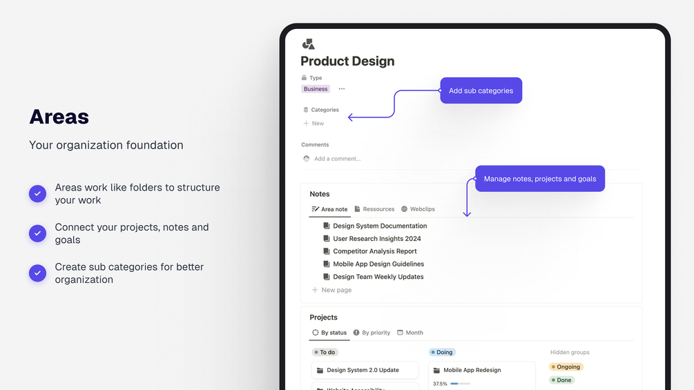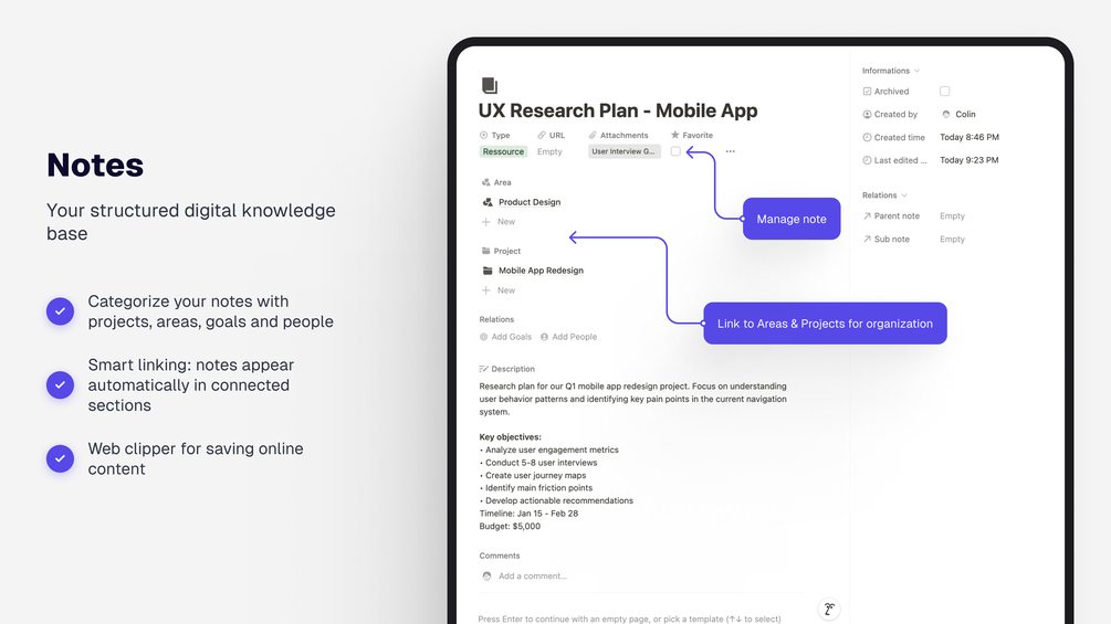 - Connected System: All projects link to relevant areas, tasks, notes, and goals