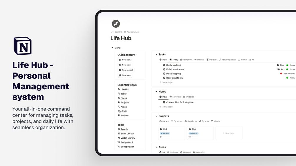 LifeHub is a comprehensive Notion template that helps you organize your entire digital life in one place. Built on the proven PARA method (Projects, Areas, Resources, Archive), this powerful system gives you a central hub for managing tasks, notes, projects, goals, and more.